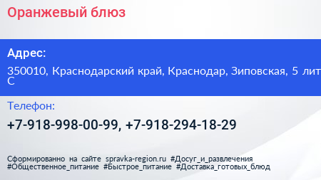 Оранжевый блюз по адресу 350010, Краснодарский край, Краснодар, Зиповская, 5 лит С в дальнейшем Организация, размещена в следующих категориях: