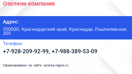 Озелени, компания по адресу 350020, Краснодарский край, Краснодар, Рашпилевская, 205 в дальнейшем Организация, размещена в следующих категориях: