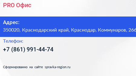PRO Офис по адресу 350020, Краснодарский край, Краснодар, Коммунаров, 266 в дальнейшем Организация, размещена в следующих категориях: