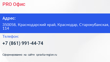 PRO Офис по адресу 350058, Краснодарский край, Краснодар, Старокубанская, 114 в дальнейшем Организация, размещена в следующих категориях: