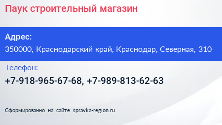 Паук, строительный магазин по адресу 350000, Краснодарский край, Краснодар, Северная, 310 в дальнейшем Организация, размещена в следующих категориях: