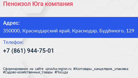 Пеноизол Юга, компания по адресу 350000, Краснодарский край, Краснодар, Будённого, 129 в дальнейшем Организация, размещена в следующих категориях:
