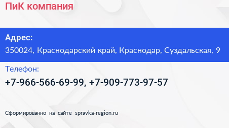 ПиК, компания по адресу 350024, Краснодарский край, Краснодар, Суздальская, 9 в дальнейшем Организация, размещена в следующих категориях: