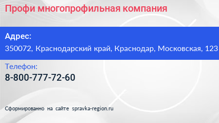Профи, многопрофильная компания по адресу 350072, Краснодарский край, Краснодар, Московская, 123 в дальнейшем Организация, размещена в следующих категориях: