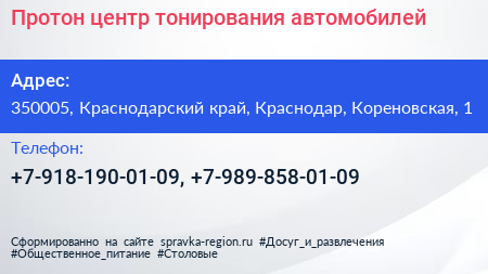 Протон, центр тонирования автомобилей по адресу 350005, Краснодарский край, Краснодар, Кореновская, 1 в дальнейшем Организация, размещена в следующих категориях:
