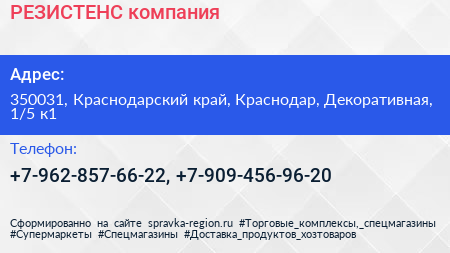 РЕЗИСТЕНС, компания по адресу 350031, Краснодарский край, Краснодар, Декоративная, 1/5 к1 в дальнейшем Организация, размещена в следующих категориях: