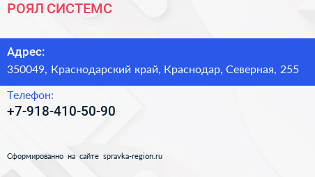 РОЯЛ СИСТЕМС по адресу 350049, Краснодарский край, Краснодар, Северная, 255 в дальнейшем Организация, размещена в следующих категориях: