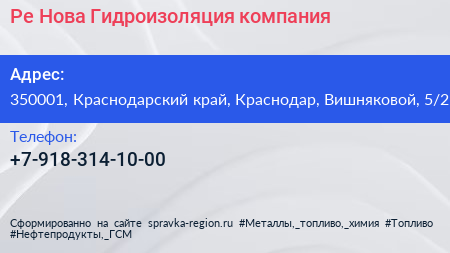 Ре-Нова Гидроизоляция, компания по адресу 350001, Краснодарский край, Краснодар, Вишняковой, 5/2 в дальнейшем Организация, размещена в следующих категориях: