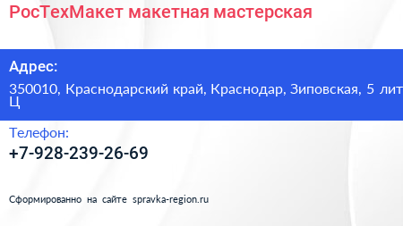 РосТехМакет, макетная мастерская по адресу 350010, Краснодарский край, Краснодар, Зиповская, 5 лит Ц в дальнейшем Организация, размещена в следующих категориях: