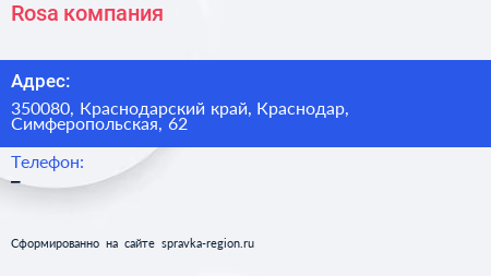 Rosa, компания по адресу 350080, Краснодарский край, Краснодар, Симферопольская, 62 в дальнейшем Организация, размещена в следующих категориях: