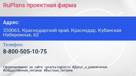 RuPlans, проектная фирма по адресу 350063, Краснодарский край, Краснодар, Кубанская Набережная, 62 в дальнейшем Организация, размещена в следующих категориях:
