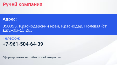 Ручей, компания по адресу 350053, Краснодарский край, Краснодар, Полевая (ст Дружба-1), 265 в дальнейшем Организация, размещена в следующих категориях:
