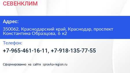 СЕВЕНКЛИМ по адресу 350062, Краснодарский край, Краснодар, проспект Константина Образцова, 6 к2 в дальнейшем Организация, размещена в следующих категориях:
