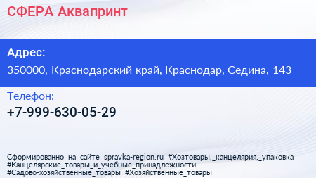 СФЕРА Аквапринт по адресу 350000, Краснодарский край, Краснодар, Седина, 143 в дальнейшем Организация, размещена в следующих категориях: