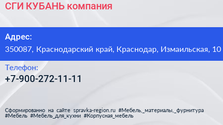 СГИ КУБАНЬ, компания по адресу 350087, Краснодарский край, Краснодар, Измаильская, 10 в дальнейшем Организация, размещена в следующих категориях: