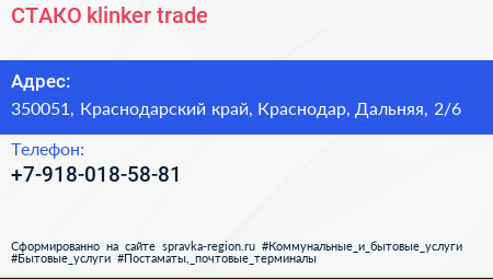 СТАКО klinker trade по адресу 350051, Краснодарский край, Краснодар, Дальняя, 2/6 в дальнейшем Организация, размещена в следующих категориях: