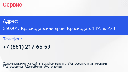 Сервис по адресу 350901, Краснодарский край, Краснодар, 1 Мая, 278 в дальнейшем Организация, размещена в следующих категориях: