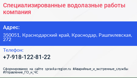 Специализированные водолазные работы, компания по адресу 350051, Краснодарский край, Краснодар, Рашпилевская, 272 в дальнейшем Организация, размещена в следующих категориях: