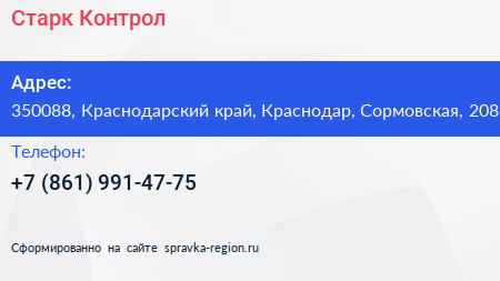 Старк Контрол по адресу 350088, Краснодарский край, Краснодар, Сормовская, 208 в дальнейшем Организация, размещена в следующих категориях: