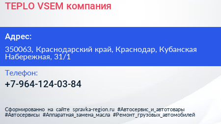 TEPLO-VSEM, компания по адресу 350063, Краснодарский край, Краснодар, Кубанская Набережная, 31/1 в дальнейшем Организация, размещена в следующих категориях: