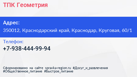 ТПК Геометрия по адресу 350012, Краснодарский край, Краснодар, Круговая, 60/1 в дальнейшем Организация, размещена в следующих категориях: