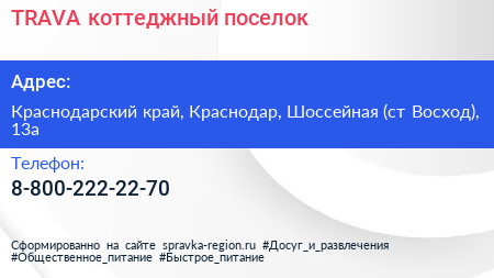 TRAVA, коттеджный поселок по адресу Краснодарский край, Краснодар, Шоссейная (ст Восход), 13а в дальнейшем Организация, размещена в следующих категориях: