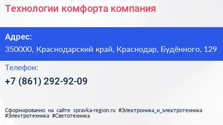 Технологии комфорта, компания по адресу 350000, Краснодарский край, Краснодар, Будённого, 129 в дальнейшем Организация, размещена в следующих категориях: