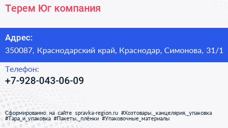 Терем-Юг, компания по адресу 350087, Краснодарский край, Краснодар, Симонова, 31/1 в дальнейшем Организация, размещена в следующих категориях:
