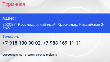 Терминал по адресу 350087, Краснодарский край, Краснодар, Российская 2-я, 162/1 в дальнейшем Организация, размещена в следующих категориях: