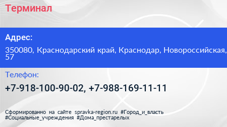 Терминал по адресу 350080, Краснодарский край, Краснодар, Новороссийская, 57 в дальнейшем Организация, размещена в следующих категориях: