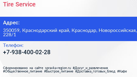 Tire Service по адресу 350059, Краснодарский край, Краснодар, Новороссийская, 228/1 в дальнейшем Организация, размещена в следующих категориях: