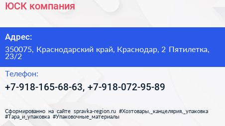 ЮСК, компания по адресу 350075, Краснодарский край, Краснодар, 2 Пятилетка, 23/2 в дальнейшем Организация, размещена в следующих категориях: