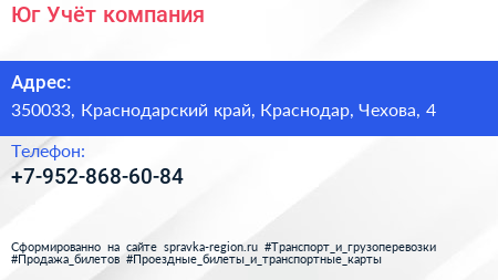 Юг-Учёт, компания по адресу 350033, Краснодарский край, Краснодар, Чехова, 4 в дальнейшем Организация, размещена в следующих категориях: