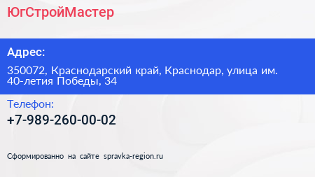 ЮгСтройМастер по адресу 350072, Краснодарский край, Краснодар, улица им. 40-летия Победы, 34 в дальнейшем Организация, размещена в следующих категориях: