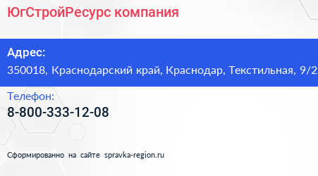 ЮгСтройРесурс, компания по адресу 350018, Краснодарский край, Краснодар, Текстильная, 9/2 в дальнейшем Организация, размещена в следующих категориях: