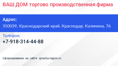 ВАШ ДОМ, торгово-производственная фирма по адресу 350039, Краснодарский край, Краснодар, Калинина, 76 в дальнейшем Организация, размещена в следующих категориях: