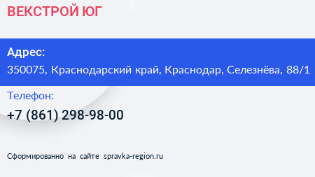 ВЕКСТРОЙ-ЮГ по адресу 350075, Краснодарский край, Краснодар, Селезнёва, 88/1 в дальнейшем Организация, размещена в следующих категориях: