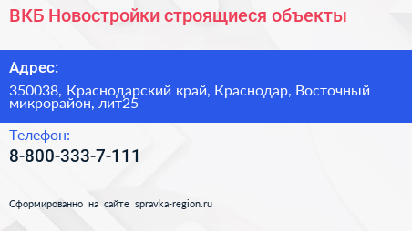 ВКБ-Новостройки, строящиеся объекты по адресу 350038, Краснодарский край, Краснодар, Восточный микрорайон, лит25 в дальнейшем Организация, размещена в следующих категориях: