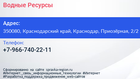 Водные Ресурсы по адресу 350080, Краснодарский край, Краснодар, Приозёрная, 2/2 в дальнейшем Организация, размещена в следующих категориях: