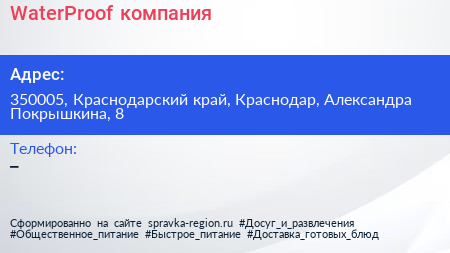 WaterProof, компания по адресу 350005, Краснодарский край, Краснодар, Александра Покрышкина, 8 в дальнейшем Организация, размещена в следующих категориях: