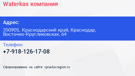 Waterkas, компания по адресу 350901, Краснодарский край, Краснодар, Восточно-Кругликовская, 64 в дальнейшем Организация, размещена в следующих категориях: