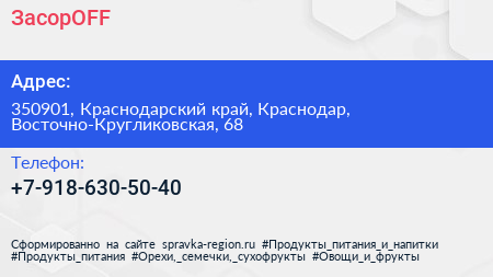 ЗасорOFF по адресу 350901, Краснодарский край, Краснодар, Восточно-Кругликовская, 68 в дальнейшем Организация, размещена в следующих категориях: