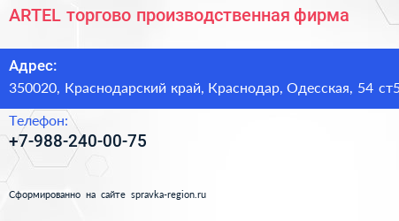 ARTEL, торгово-производственная фирма по адресу 350020, Краснодарский край, Краснодар, Одесская, 54 ст5 в дальнейшем Организация, размещена в следующих категориях: