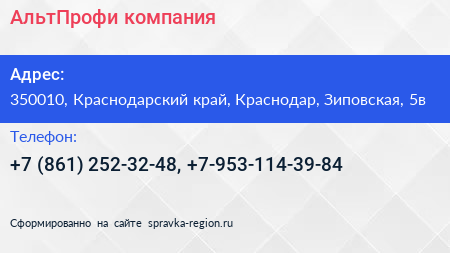 АльтПрофи, компания по адресу 350010, Краснодарский край, Краснодар, Зиповская, 5в в дальнейшем Организация, размещена в следующих категориях: