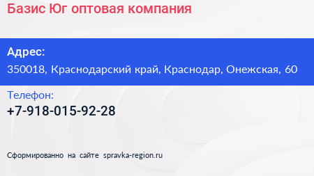 Базис-Юг, оптовая компания по адресу 350018, Краснодарский край, Краснодар, Онежская, 60 в дальнейшем Организация, размещена в следующих категориях: