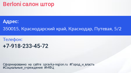 Berloni, салон штор по адресу 350015, Краснодарский край, Краснодар, Путевая, 5/2 в дальнейшем Организация, размещена в следующих категориях: