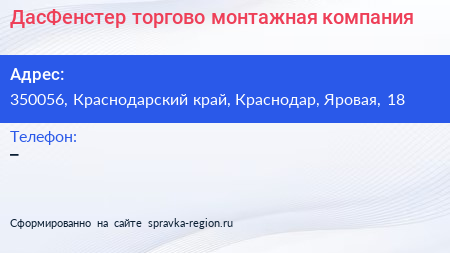 ДасФенстер, торгово-монтажная компания по адресу 350056, Краснодарский край, Краснодар, Яровая, 18 в дальнейшем Организация, размещена в следующих категориях: