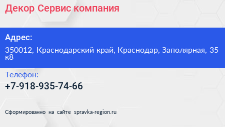 Декор Сервис, компания по адресу 350012, Краснодарский край, Краснодар, Заполярная, 35 к8 в дальнейшем Организация, размещена в следующих категориях: