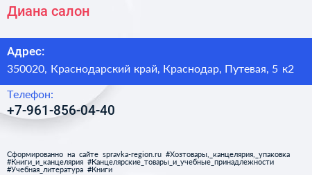 Диана, салон по адресу 350020, Краснодарский край, Краснодар, Путевая, 5 к2 в дальнейшем Организация, размещена в следующих категориях: