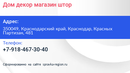 Дом декор, магазин штор по адресу 350049, Краснодарский край, Краснодар, Красных Партизан, 481 в дальнейшем Организация, размещена в следующих категориях: